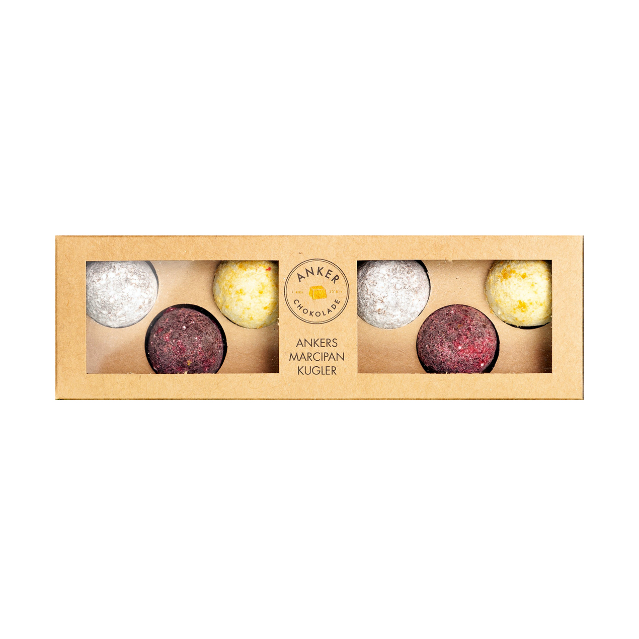 Disse marcipankugler fra Anker Chokolade er håndlavede og økologiske, og består af tre smagsvarianter: marcipan / kokos / flormelis, marcipan / passionsfrugt og marcipan / kirsebær — alle overtrukket med mørk chokolade.