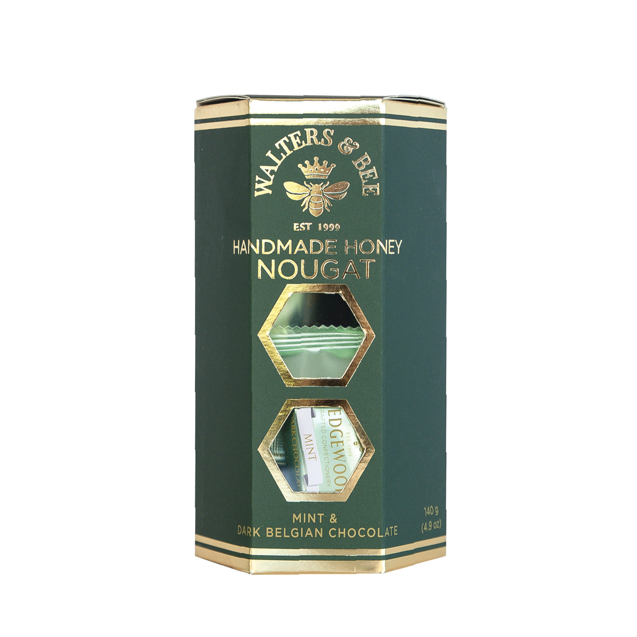 Walters Nougat Bon Bon Mint & Dark Belgian Chocolate Giftbox er en elegant gaveæske fyldt med udsøgte chokoladebidder. Hver bonbon består af blød, håndlavet nougat kombineret med frisk mynte og overtrukket med mørk belgisk chokolade. Den fine balance mellem den kølige mynte og den rige chokolade skaber en raffineret smagsoplevelse, der både er frisk og intens. Perfekt som en luksuriøs gave eller til at forkæle sig selv med noget ekstra særligt.