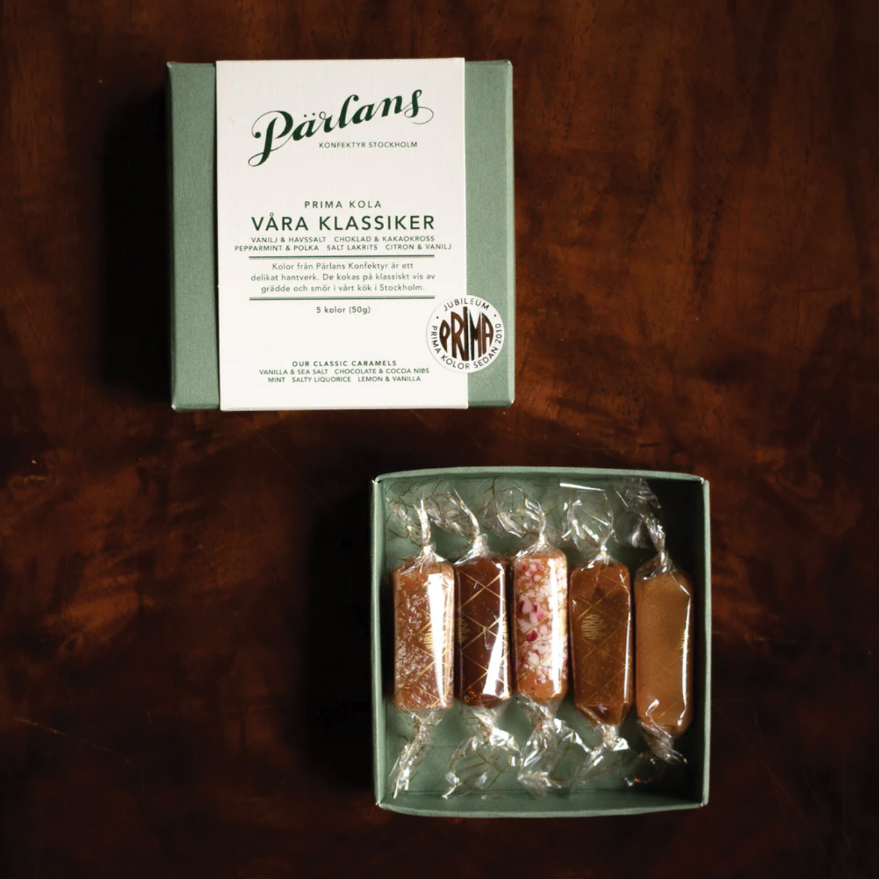 Pärlans “Our Classics” er en elegant æske med 5 stykker håndlavet, blød karamel i et udvalg af Pärlans’ mest elskede smagsvarianter. Lavet med ægte smør, fløde og sukker kogt til perfektion – hver karamel smelter langsomt på tungen og afslører en rig, rund sødme. En klassiker, der emmer af nostalgi og håndværk.