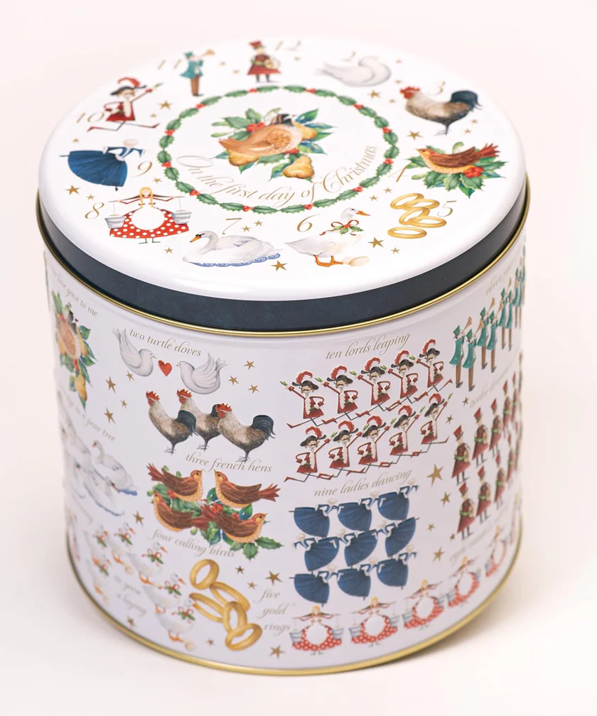 Gør december ekstra festlig med julegaven fra Farmhouse Biscuits – “12 Days of Christmas Assortment Barrel Tin”. Denne elegante tønde-dåse rummer et forsøgt udvalg af sprøde småkager i klassiske juletager: krydret frugt- og kryddersmåkage, orange småkage med mørk chokoladebiter, honning- og havresmåkage og mere. En vidunderlig gave, der kombinerer tradition, kvalitet og julestemning – perfekt til at dele med familie og venner eller som en elegant værtindegave.