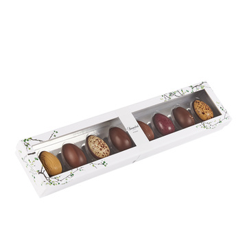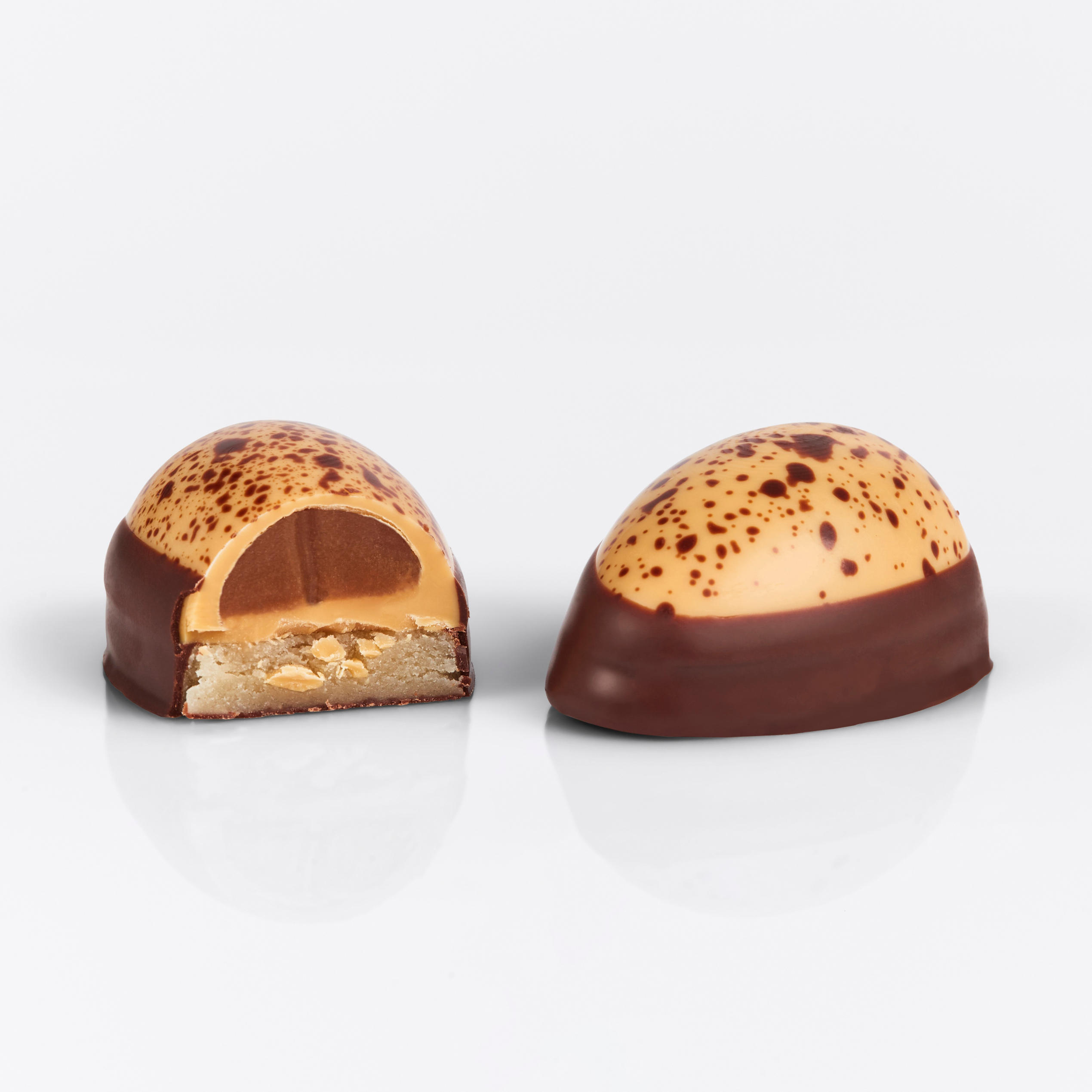 Praliné: Mælkechokolade 49%, marcipan og nougat