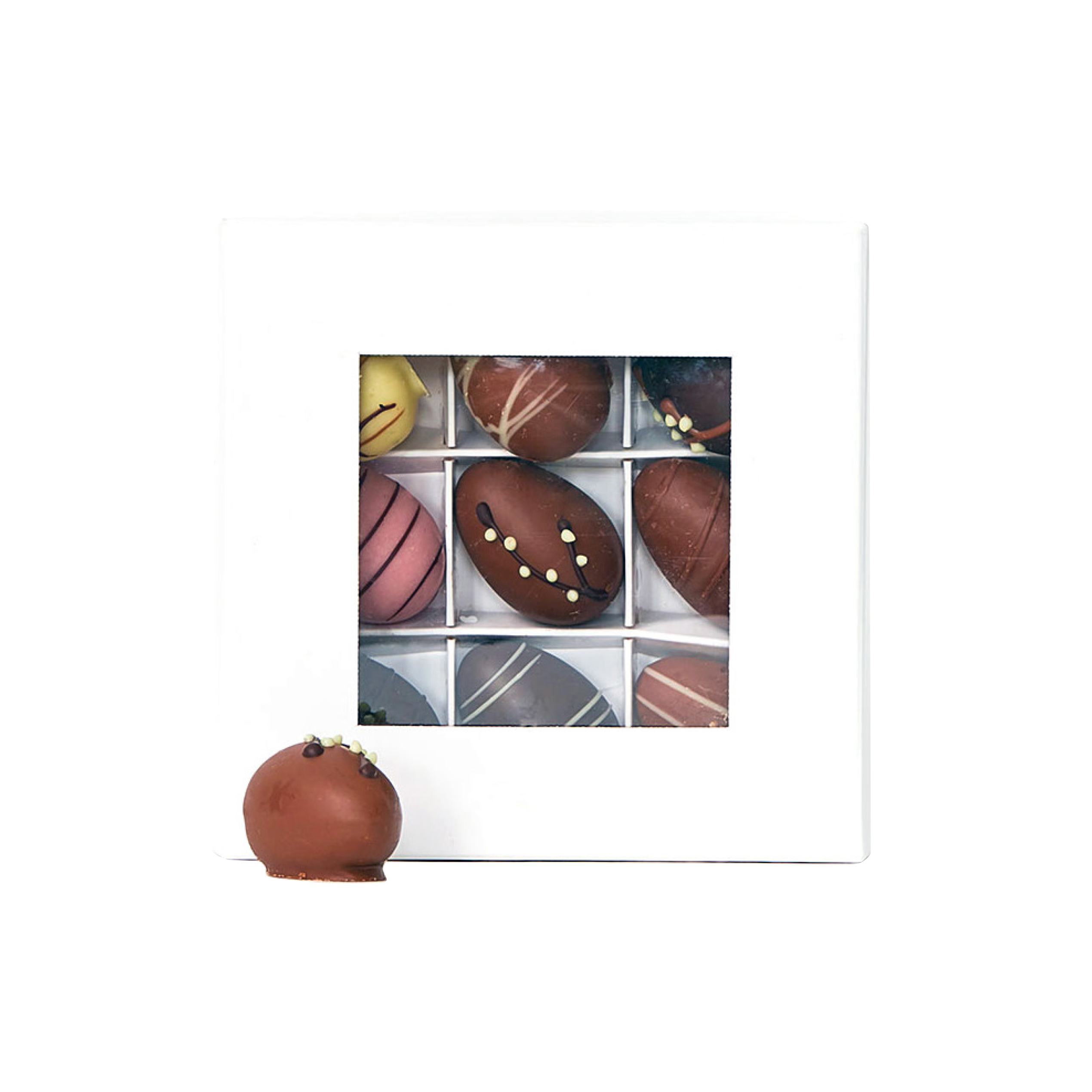 Den flotte hvide lakæske indeholder 18 æg fordelt på 9 forskellige slags.