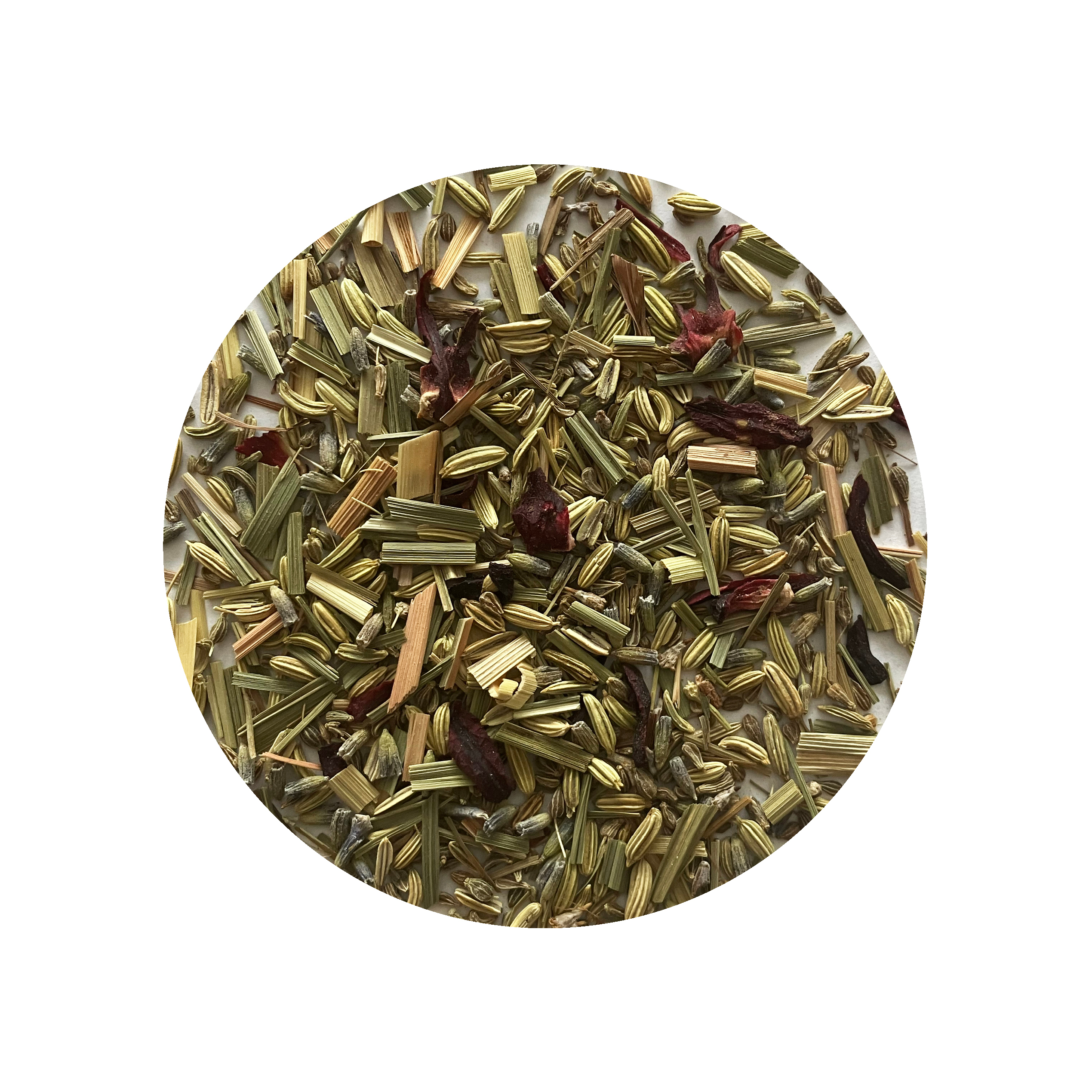 Fennikel*, anis*, citrongræs*, lavendelblomst*, hibiscusblomst*, naturlig fennikelaroma. * = økologisk.