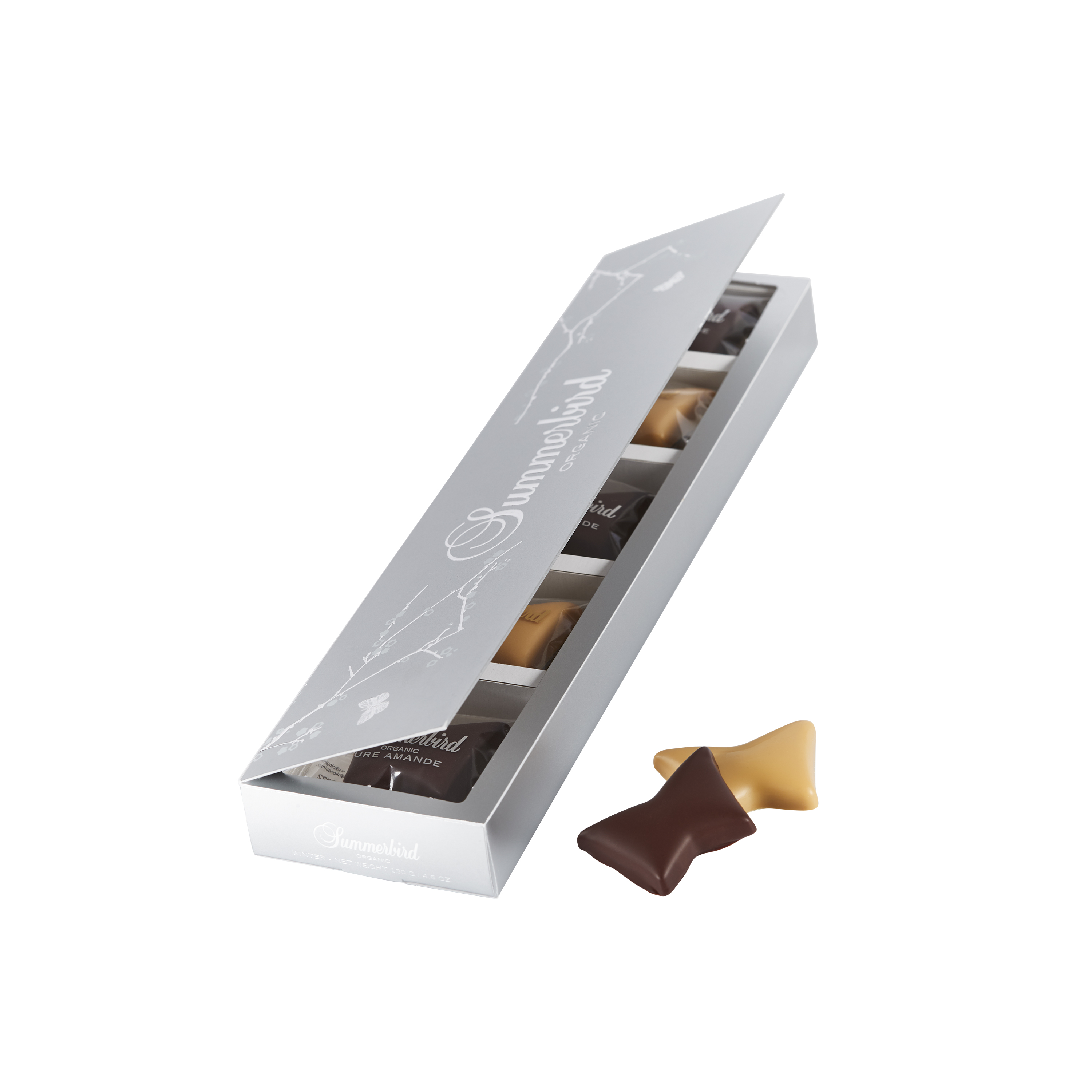 Summerbird Winter Symphony er en harmonisk samling af økologisk chokolade, skabt til at indfange vinterens smage og stemning. Kollektionen forener mørk, lys og hvid chokolade med nuancer af nødder, karamel, frugt og krydderier – komponeret med den finesse og balance, der kendetegner Summerbird.