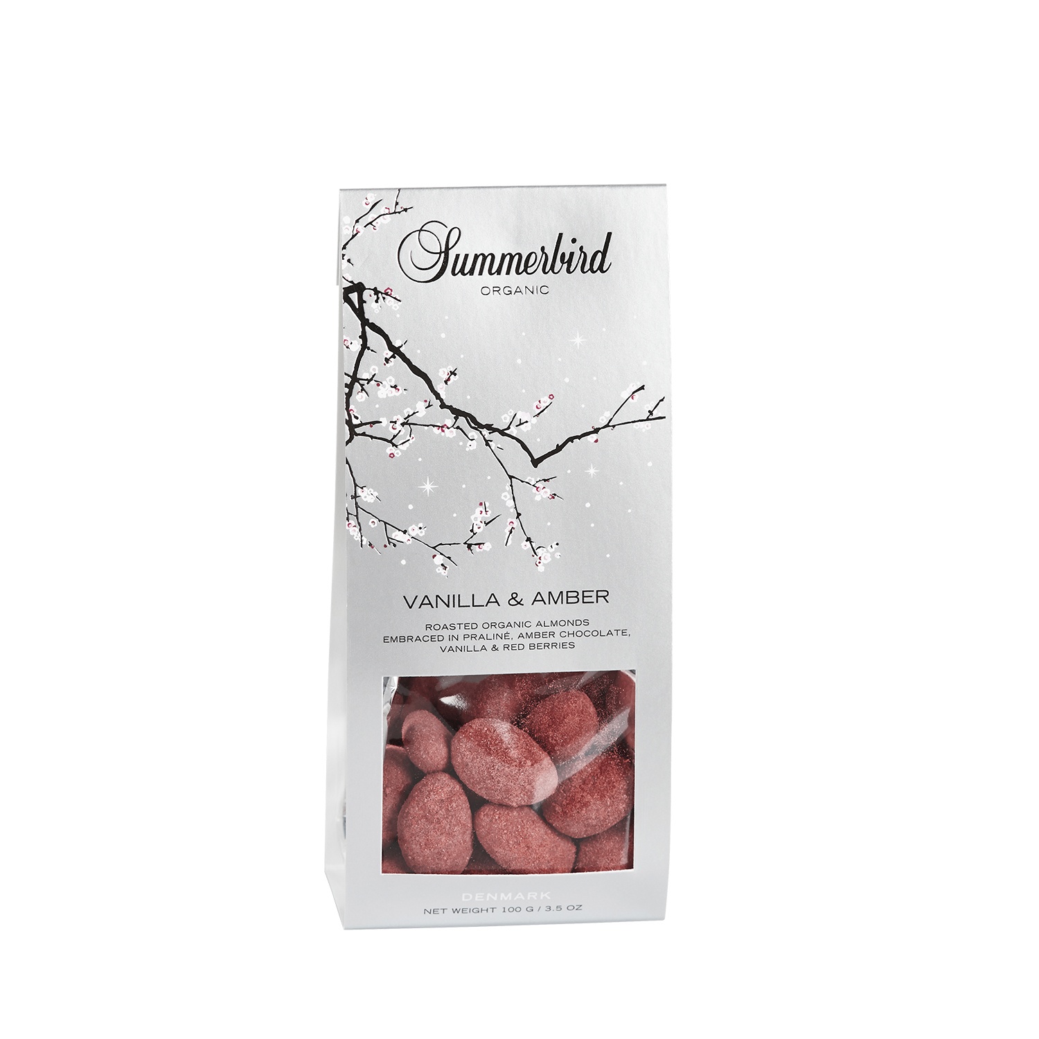 Summerbird Vanilla & Amber er en raffineret kombination af let ristede spanske mandler, sprød krokant og praliné, overtrukket med prisvindende Amber Classic-chokolade. De fine mandler afrundes med et strejf af vanilje og røde bær, som giver en harmonisk balance mellem sødme, friskhed og dyb chokoladesmag.