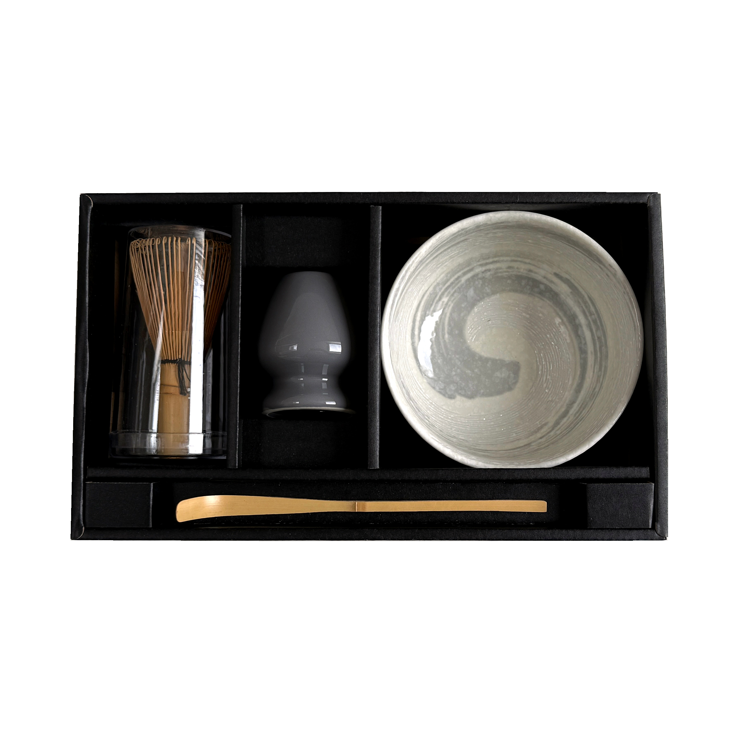 Matchasæt bestående af matcha skål, bambus piskeris, bambus måleske samt holder til bambus piskeris. Pakken indeholder ikke matchapulver.